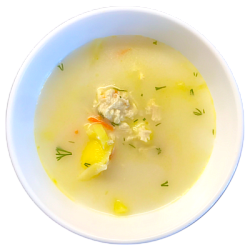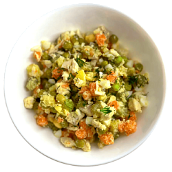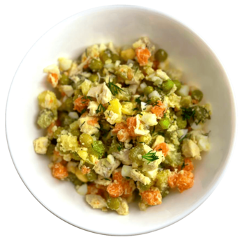 Классический салат "Оливье" в обновлённой версии с нежным куриным филе вместо колбасы. Сочетание отварных овощей, яиц, маринованных огурцов и зелёного горошка создаёт гармоничный вкус, знакомый с детства, но более лёгкий и полезный.