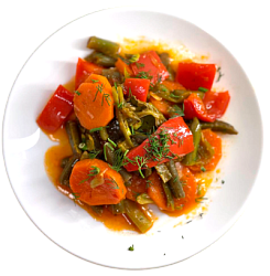 Ароматное грузинское блюдо с нежной стручковой фасолью, сладким перцем и пряным чесночно-томатным соусом. Вегетарианское лакомство с кавказским характером.